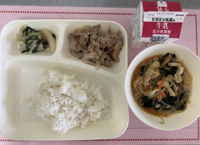 1/28(水)の給食は、ごはん、牛乳、豚肉のスタミナ焼き、五目汁、きくなと白菜のおひたしです。