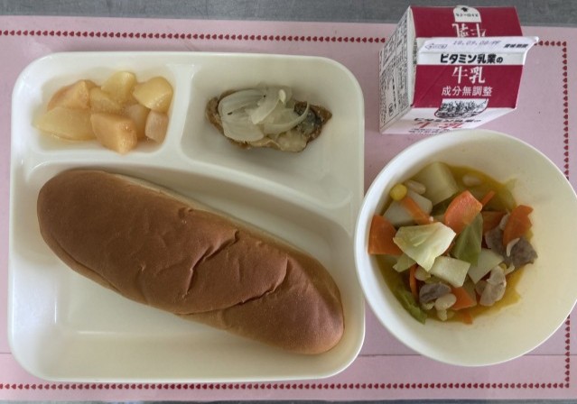 1/29(木)の給食は、黒糖パン、あじのレモンマリネ、てぼ豆のスープ煮、白桃(カット缶)です。
