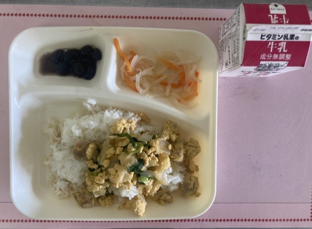 1/30(金)の給食は、牛乳、親子丼、紅白なます、黒豆の煮ものです。
