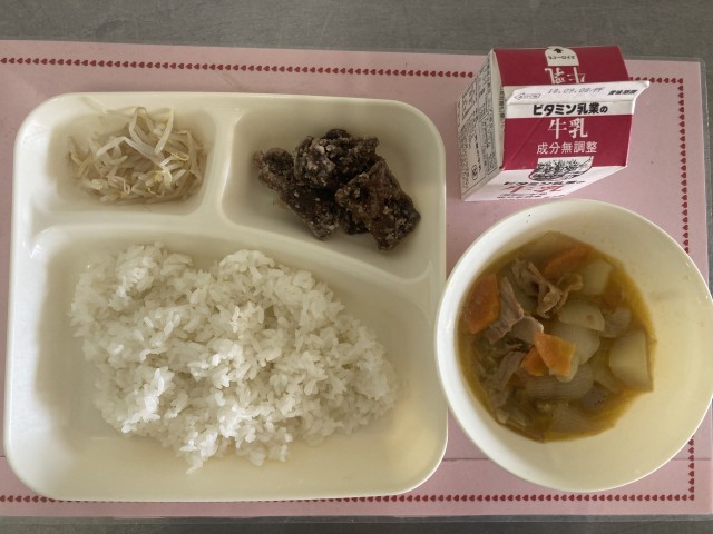 2/2(月)の給食は、ご飯、牛乳、くじらの竜田揚げ、豚肉とじゃがいもの煮もの、もやしの甘酢あえです。