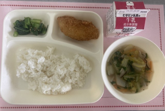 2/9(月)の給食は、ごはん、牛乳、たらフライ、うすくず汁、小松菜のごまあえです。