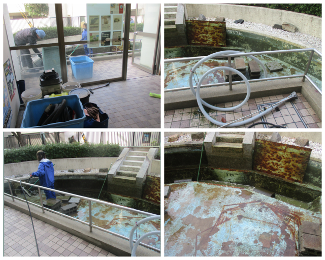 当日は朝早くから作業が行われ、池の水を抜いてたまった汚れを丁寧に取り除きました。