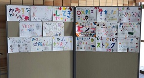 玄関にお見せポスター一覧が掲示された玄関は、登下校時に楽しみに眺めている姿が多く見られました。