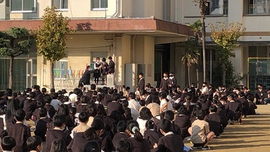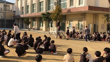 まずは、運動場で全体会。児童会の代表の始めの言葉の後、各学級のお店のアピールがありました。 -
