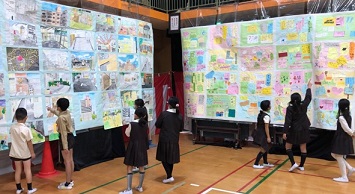 写真上 旧1年(現2年)と新1年 「野田小学校のお気に入りの場所を紹介しよう」