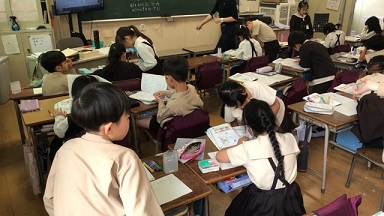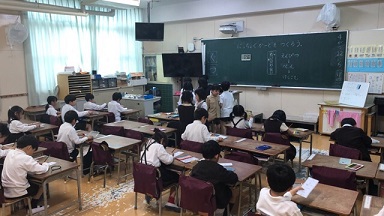 4年生です。学級活動の時間のようで、学級会が開催されていました。議長席も作られ「コの字」の形に机も並べて場づくりも本格的でした。