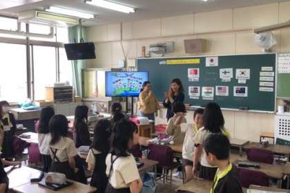 3年生です。2年生までは週2回、10分間の短時間学習だけでしたが、3年生からは、週1時間、外国語活動の学習が始まりました。英語専科の先生とC-NETの先生とのティームティーチングで、アクティブに学習しています。 -