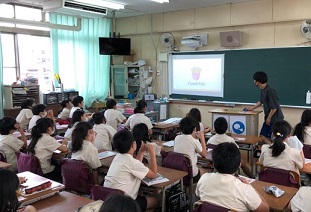 1年生も、映像を見ながらアルファベットの学習。abc…と順に音楽に合わせて読みながら、先生が指定した色の画面では拍手をする活動をしていました。