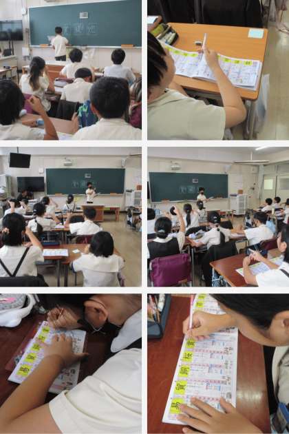 1人が前に出て、みんなに漢字を教えています。