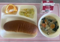 【今日の献立】・黒糖パン・牛乳・鶏肉とほうれんそうのシチュー・キャベツとコーンのサラダ・デコポン「鶏肉とほうれんそうのシチュー」は、鶏肉、ベーコン、じゃがいも、玉ねぎ、にんじん、ほうれんそう、エリンギ...