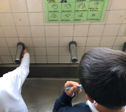 給食の後は歯磨きをします。学校生活にも慣れてきました。
