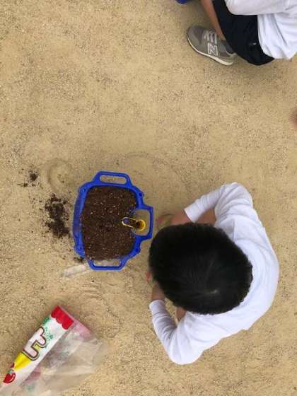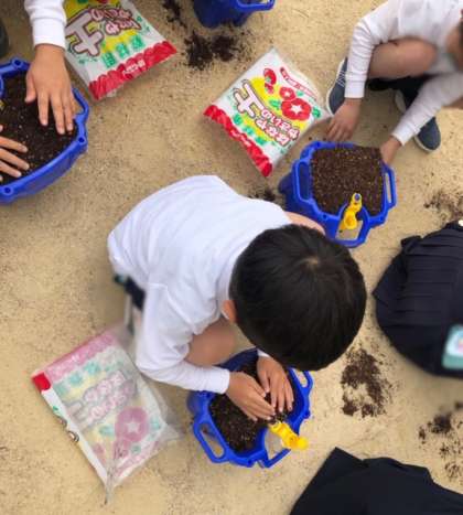 植木鉢に優しく土を入れて、そっと種をおいて、優しく土をかけてあげました。きれいな花が咲くように願いを込めてお世話をしたいと思います。