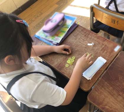 お母さんの作ってくれた12個のパイを3個ずつ、お皿の上にとっていきます。おはじきを使って考えました。