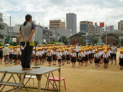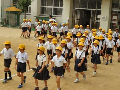 吉野小学校では、今年の朝会から終了時に行進をして教室に入るようにしました。それは、一つには、みんなで指導しようということ。もう一つには、秋の運動会時に何度も行進練習をしなくても普段からしようということ。これを目標に取り組んでいます。みんな随分行進が上手になりました。