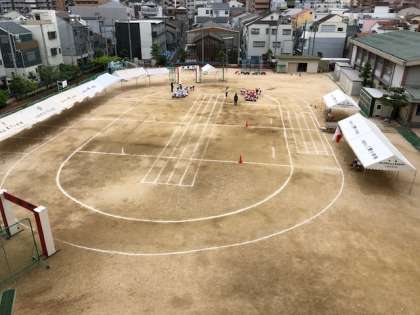 今年は日ざしが強いので、大開小学校や西野田幼稚園に協力していただき、児童席にテントを設置しました。安全で楽しい運動会にしたいと思います。