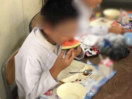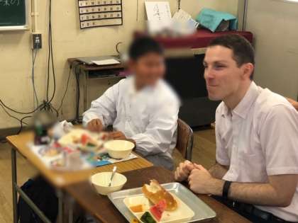 オーエン先生も一緒に食べました。楽しい給食の時間です。