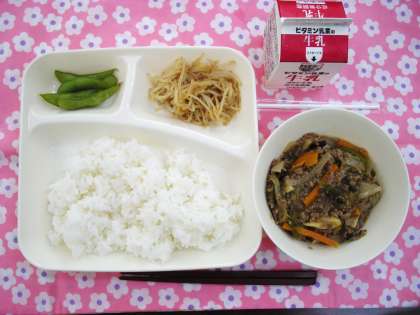 献立は、マーボーなす、もやしのごま酢あえ、えだまめ、牛乳、ごはんでした。