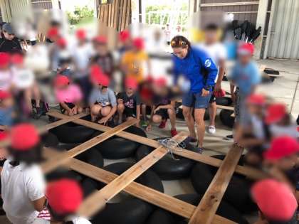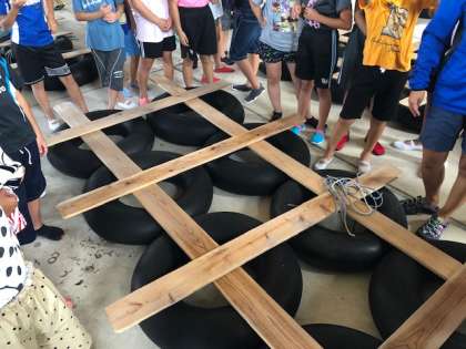 筏作りについて説明を聞いています。タイヤと板がバラバラにならないようにしっかりと結びます。