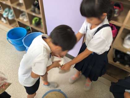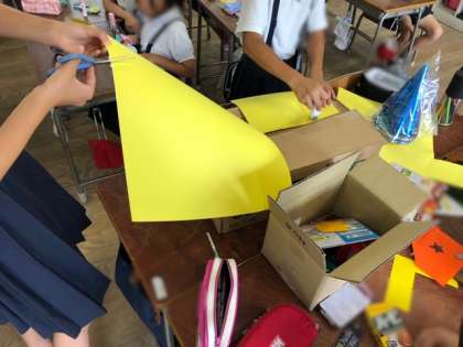 明日の吉野子ども秋まつりに向けて、ただ今準備中です。縦割り班で協力していろいろと作ったり、考えたりしています。