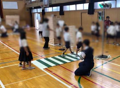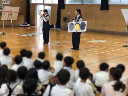 今日は大阪府警・福島警察の方に来ていただき、交通安全のお話を聞きました。雨のため講堂でお話を聞きました。クイズをしたり、歩く練習をしたりしました。みんなとっても集中していました。