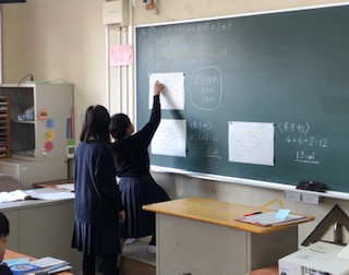 ひし形の面積の求め方をいろいろ考えました。図を元に考え方を説明しました。