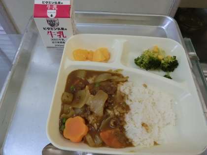今日の給食は、冬野菜のカレーライス、ブロッコリーとコーンのサラダ、黄桃の缶づめでした。