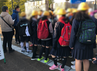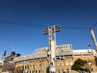?キッザニア甲子園の入り口前です。すごくいい天気です。甲子園球場も見えます。