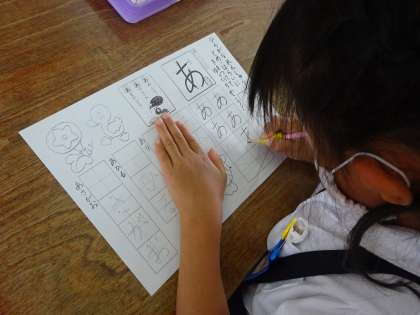 きょうは、「あ」のつくことばを みんなでさがしてみたり、かきじゅんのれんしゅうをしてみたりしました。えんぴつを ただしいもちかたで もって かくことができるように がっこうから「えんぴつほるだー」を わたしました。えんぴつのさきを とりがくちばしでつつくようなかんじで うごかしてみましょう。おうちでもれんしゅうを してみましょう。きっと すてきなもじが かけるように なりますよ。