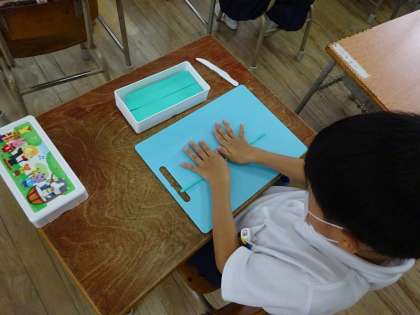 きょうの2じかんめに ねんどで あそびました。ねんどを ちぎって まるめたり のばしたり しました。のばすときは どれだけ のばすことが できるのか おともだちと きそいあっていました。ねんどを たいらにのばすときは てのひらを つかって たいじゅうを かけて いっしょうけんめい のばしていました。なかには たちあがって ねんどを たいらにしようと がんばっている ようすも みられました。
