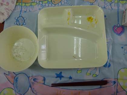そして、きゅうしょくでは、きのうから すこし おかずが ふえたのですが、せんせいたちは、おさらに ごはんつぶを のこさないように きれいに たべている ようすをみて かんげき!いっしょうけんめい たべて、おさらも きれい!すてきな 1ねんせいです。