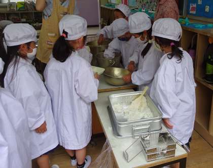 こんしゅう はじめから、おそうじや きゅうしょくとうばんのしごとに とりくんでいます。おもい しょっきや しょっかんを ちからを あわせて はこびます。そして、ひとりぶんの りょうを きめて じょうずに はいぜんします。「おうちでも やってるよ!」や「はじめてやったけど おうちでも やってみる!」など、とても たのもしく かんじています。