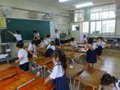 そして、そうじも、これまた みんな いよくてき!ほうきの つかいかたが まだ むずかしそうな こも いますが、つくえふきも つくえはこびも こくばんふきも ろうかそうじも とっても じょうず!「もっと おそうじ したい!」というこが おおいです!1ねんせい すてき!
