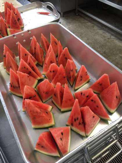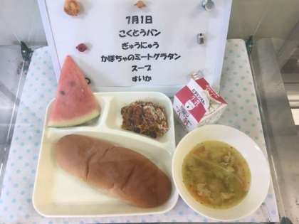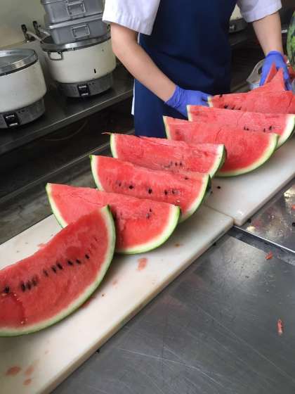今日から7月!給食では、年に1回のすいかが、登場しました。今日のすいかは鳥取県産。給食では、すいか一玉を64分の1に切り分け、バットにきれいに並べます。子どもたちも「すいかや〜!」「めっちゃ甘い〜!」と喜んでいました。