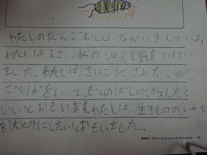 また、生きものをお世話して関わりを深めていく活動を7月頃からはじめ、いよいよ大詰めになりました。成長の変化や様子を見続ける中で、生きものにも一つの命があることや、命を大切にしていくことの重要さにも気付いてきました。お世話の工夫も一人一人の思いや考えを持って「死なせない!」という強い気持ちを持つ子どもたちもいました。