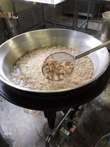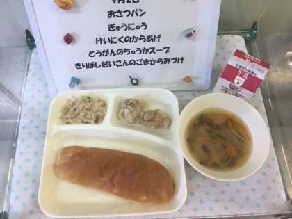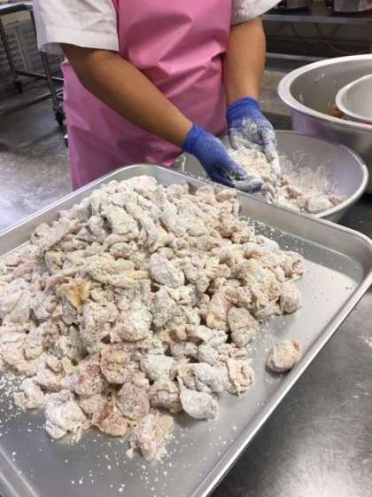 今日は、子どもたちに大人気のからげでした。給食室で鶏肉に味つけし、でんぷんをまぶし、大きな釜で揚げています。給食室には、エアコンがないので、とても暑い中、調理をしています。でも、子どもたちが、全部残さず食べてくれると、とてもうれしいです。