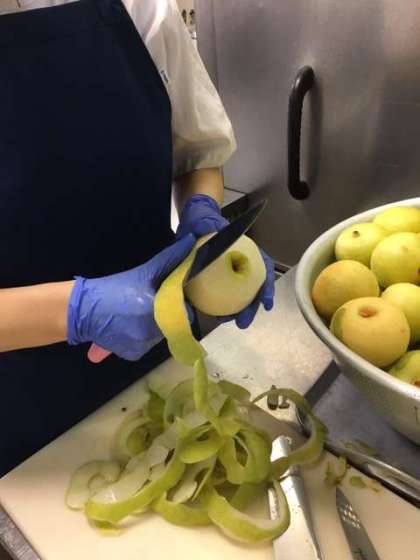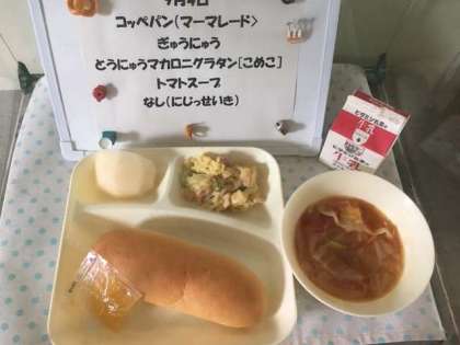9月〜10月は、「食物アレルギーサポート月間」です。小麦粉を使用せず、米粉を使ったカレールウの素や、卵を使用しない「ノンエッグマヨネーズ」を使った献立が登場します。今日は、小麦アレルギー、乳アレルギーの子どもたちに配慮した「豆乳マカロニグラタン」でした。米粉で作ったマカロニやパン粉、豆乳を使用し、とろみは上新粉でつけています。いつものグラタンよりもあっさりとした味に仕上がっていました。そして、今日のデザートは「なし(二十世紀)」。調理員さんが、一つずつ皮をむいてくれました。全部で110個!みずみずしくて、おいしかったですね。
