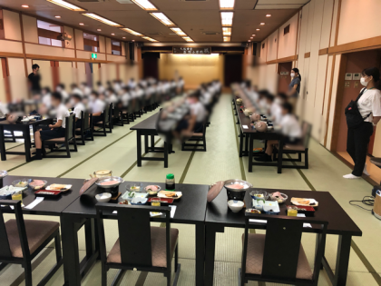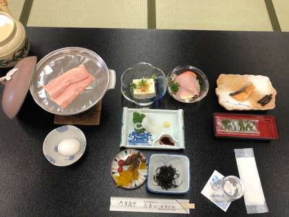 朝食はベーコンエッグです。一人ずつ卵をわって調理して食べます。