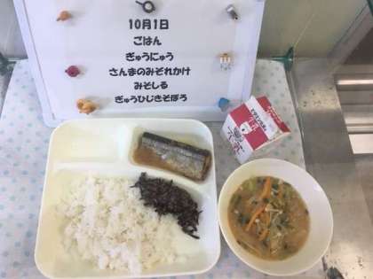今日の給食は、旬の魚「さんま」が登場しました。さんまを焼いた後、大根おろしのタレをかけてさっぱり。とても美味しい秋の味でした。さんまは少し骨が多い魚で、子どもたちは苦戦していましたが、「魚きらいやけど、おいしい!食べれた!」と言ってくれる子どももいました。今年は、例年より、さんまの価格が少し高く残念ですが、ぜひ、おうちでも旬の味を味わっていただければ、と思います。