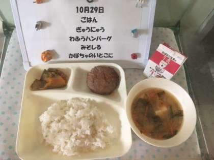 10月29日の献立は「和風ハンバーグ、かぼちゃのいとこ煮、みそ汁」でした。いとこ煮は、かぼちゃとあずきを甘辛く煮た料理です。いとこ煮の由来は、かぼちゃとあずきを別々に(めいめいに)煮た後、一緒にすることから(姪と姪はいとこにあたる)という説や、あずきとかぼちゃは順番に(おいおい)煮ることから(甥と甥はいとこにあたる)名前がついた、と言われています。