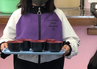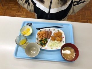朝食のメニューはコロッケとウィンナーです。食事係さん大活躍です。