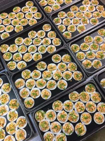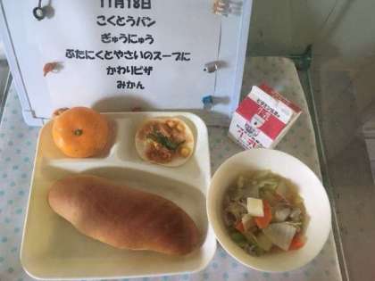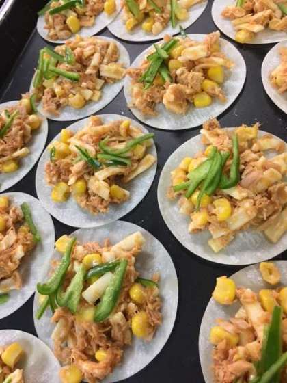 今日の献立は「変わりピザ」でした。ぎょうざの皮の上にツナ、コーン、ピーマン、ピザソース、チーズを混ぜたものをのせ、焼いています。お家でも、オーブントースター等でできます。作ってみてくださいね。
