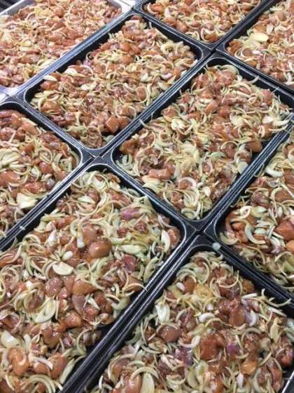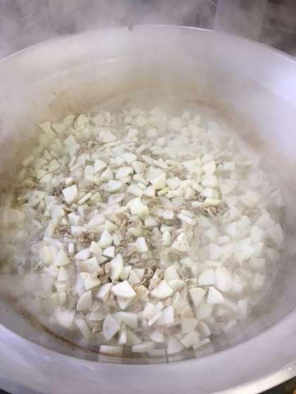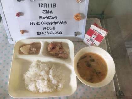 今日の献立は「鶏肉の甘辛焼き、みそ汁、だいこんの煮もの」でした。鶏肉は、たまねぎと一緒に砂糖やしょうゆで下味をつけ、焼き物機で焼いています。旬のだいこんは豚肉と一緒に煮て、みりん、しょうゆで味つけし、最後にとろみをつけています。みそ汁も野菜たっぷりで、体が温まりました。