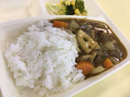 12月に登場するカレーは、じゃがいもの替わりに、れんこん、だいこんなどの冬野菜を使用した「冬野菜のカレーライス」です。やわらかくなっただいこんが美味しく、れんこんの歯ごたえが良いカレーで、子どもたちに好評でした。ぜひ、お家でも作ってみてくださいね。