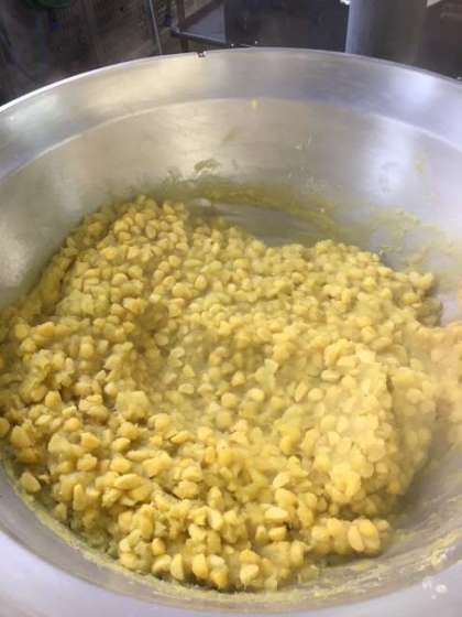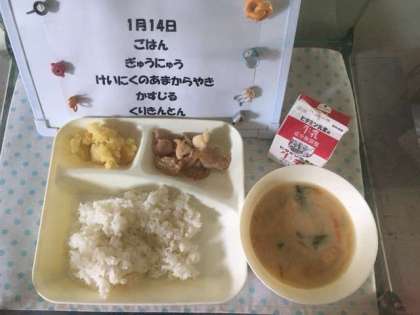 今日の献立は「鶏肉の甘辛焼き、かす汁、くりきんとん」でした。酒かすを使ったかす汁は、年に1回の献立です。給食なので、少量の酒かすしか使用しませんが、ほんのりとする酒かすの香りが冬らしい、温かい汁物でした。くりきんとんも年に1回1月に登場する献立です。さつまいものと栗の甘さが美味しいデザートでした。
