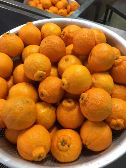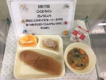今日の給食は、豚肉のオイスター焼き、あつあげ、だいこんの他に、はくさい、たまねぎ、にんじん、にらの入った中華味の煮もの、デコポンの組み合わせでした。デコポンの名前は、おでこの「デコ」とでこぼこの「デコ」からきているそうです。甘くてとても瑞々しい旬の果物でした。