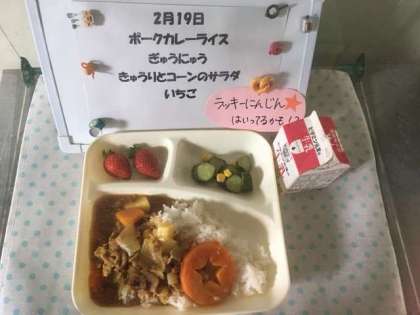 今日の給食は「ポークカレーライス、きゅうりとコーンのサラダ、いちご」でした。みんな大好きなカレーと長崎県産の甘いいちごの組み合わせで、子どもたちは大喜びでした。