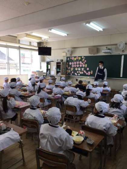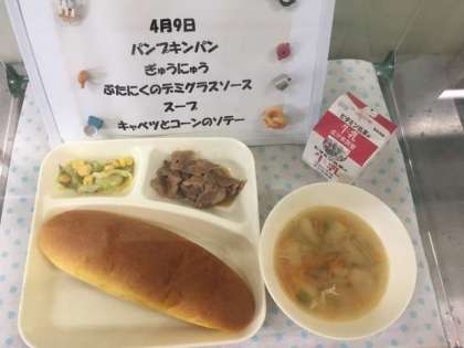 今日から令和3年度の給食がスタートしました。献立は「パンプキンパン、牛乳、豚肉のデミグラスソース、スープ、キャベツとコーンのソテー」でした。、新1年生も今日から初めての給食です。給食中は、みんな前を向いておしゃべりせず、静かに給食を食べることができました。「給食おいしい!」と言ってくれる1年生もたくさんいました。