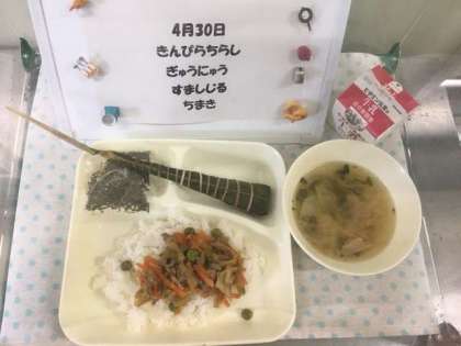 今日は、こどもの日の行事こんだてで、「きんぴらちらし、すまし汁、ちまき」でした。ちまきには、子どもの健やかな成長と魔除けの意味があるそうです。ちまきを食べて、吉野小学校のみなさんが、元気で大きくなりますように!コロナも早く収束しますように!