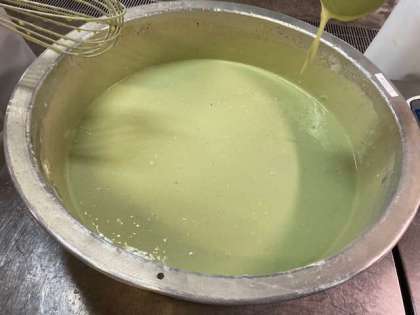 今日の給食は、「かやくごはん、みそ汁、まっ茶ういろう」でした。「ういろう」は、名古屋の名物ですが、大阪市の給食にも年2回ほど登場します。上新粉(米粉)、砂糖、水を混ぜ合わせ蒸しています。今日は、そこに抹茶を混ぜ込みました。1クラス1バットの配缶で、ひとり分ずつ切り分けます。ほののかな甘さが美味しい和風のデザートでした。