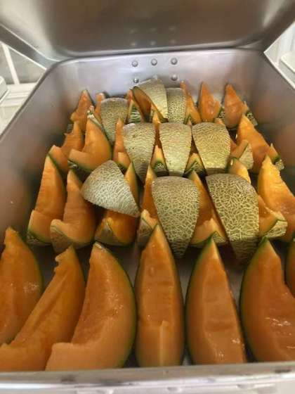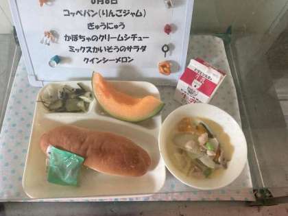 今日の献立は「かぼちゃのクリームシチュー、ミックス海そうのサラダ、クインシーメロン」でした。メロンは年に1回登場する果物です。今日のメロンは茨城県産でした。一人1/8切れで、調理員さんが種をとって準備してくれました。